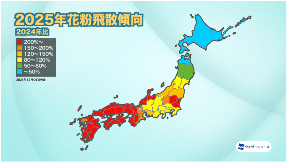 また、飛散量は、西日本や北陸、関東北部で2024年を大きく上回り、北日本では下回る地域が多い予想。