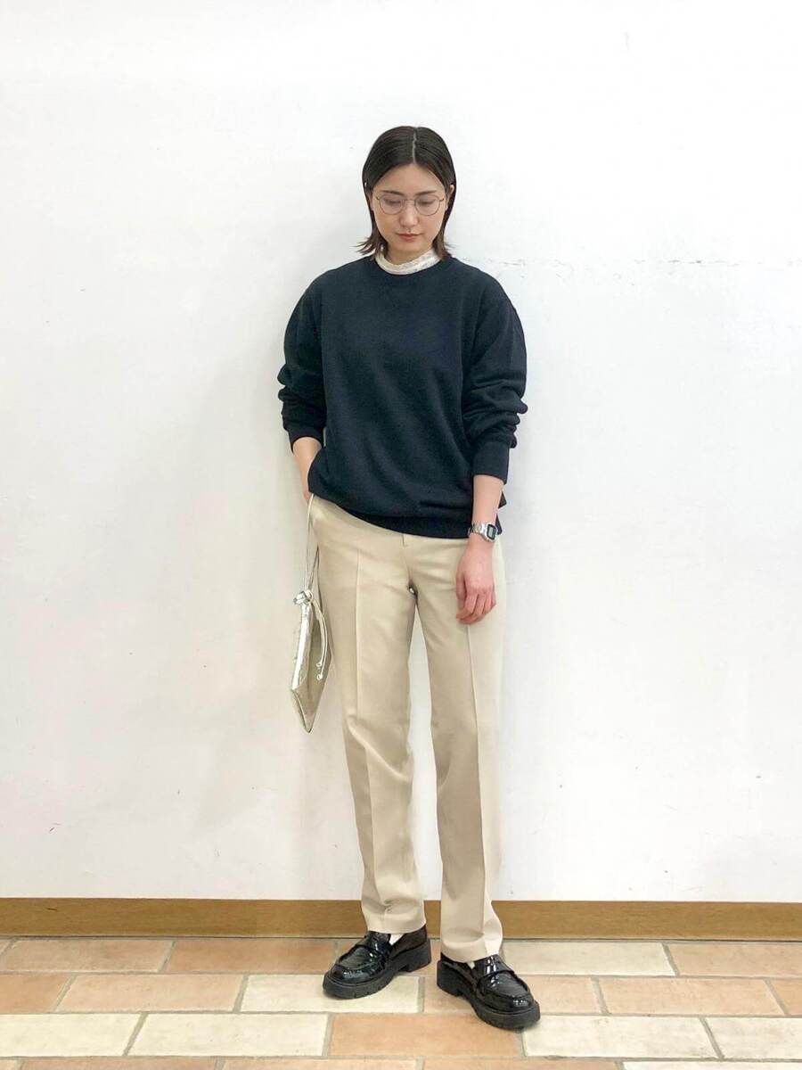 カジュアルなスウェットも感動スリムパンツのセンタープリーツの効果でキレイ目な印象に 。