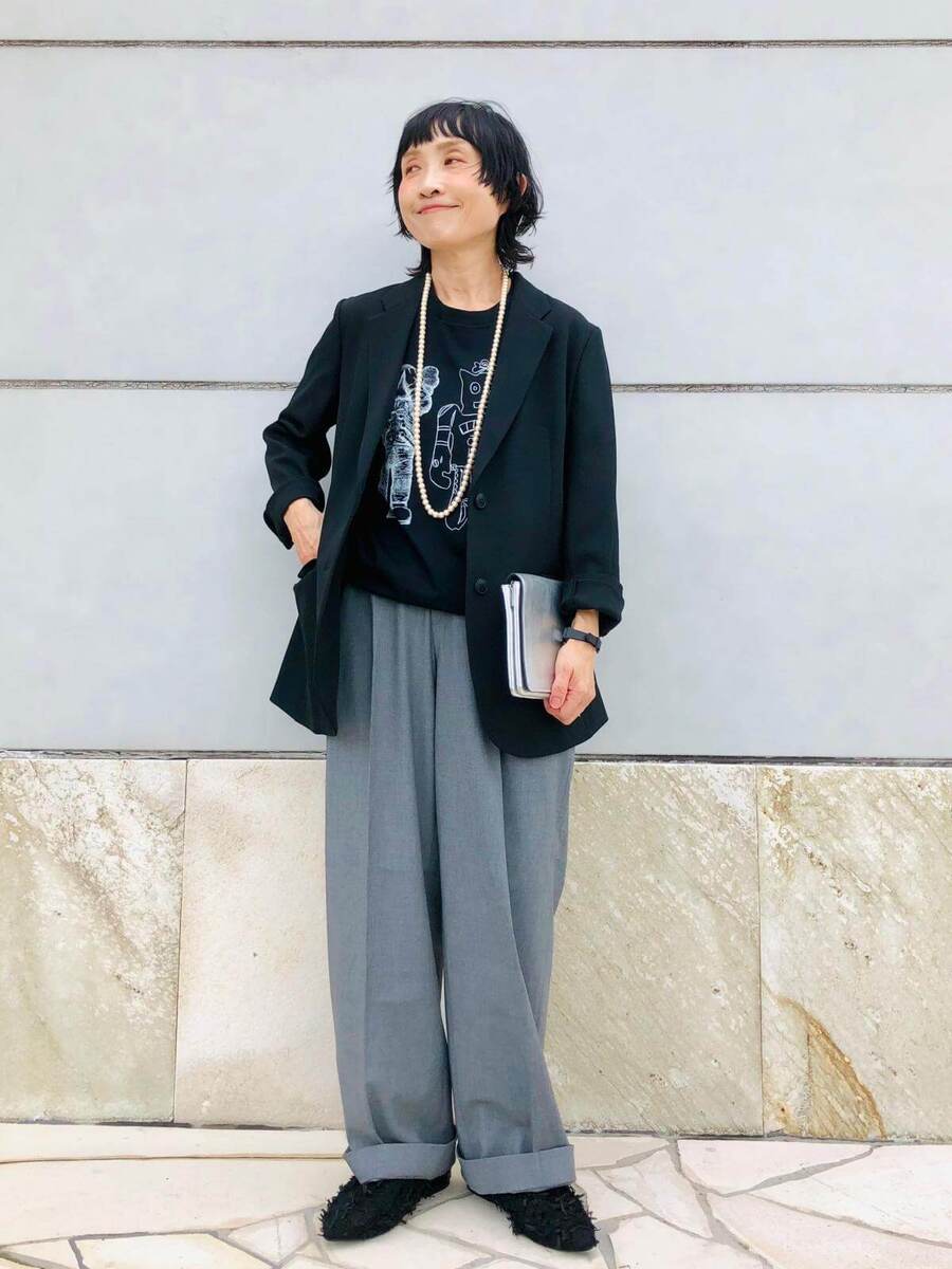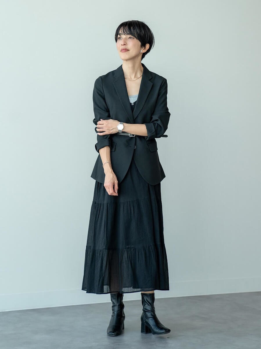 スカートとも組み合わせやすい、ボトムスを選ばない丈感も、感動ジャケットの特徴のひとつ。
