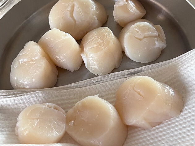 ホタテはキッチンペーパーで挟んで水気をしっかりとります。水分が結構出ていたので、この工程は重要ですね。