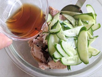 耐熱容器の中に溜まった水分を捨ててから、汁を切ったサバ缶、マヨネーズ、おろしにんにくを加えます。
