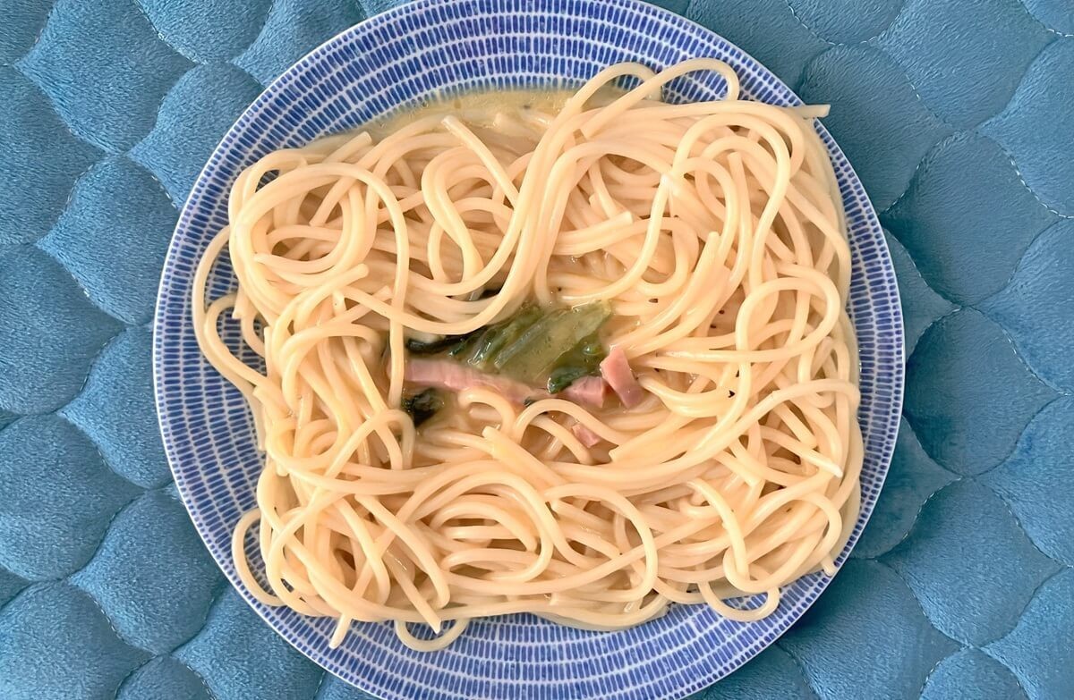 レンジ調理難しめのカルボナーラをチョイス。画像は美味しそうですが果たしてうまくできるかな?