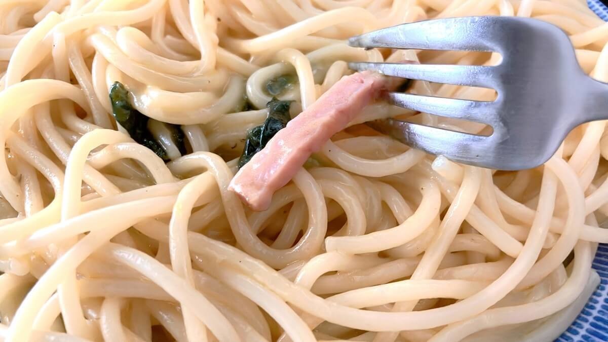 肉厚のベーコンは存在感◎ほうれん草も入って見た目もいいですね!結構太麺なので、フォークに巻くのが大変です。