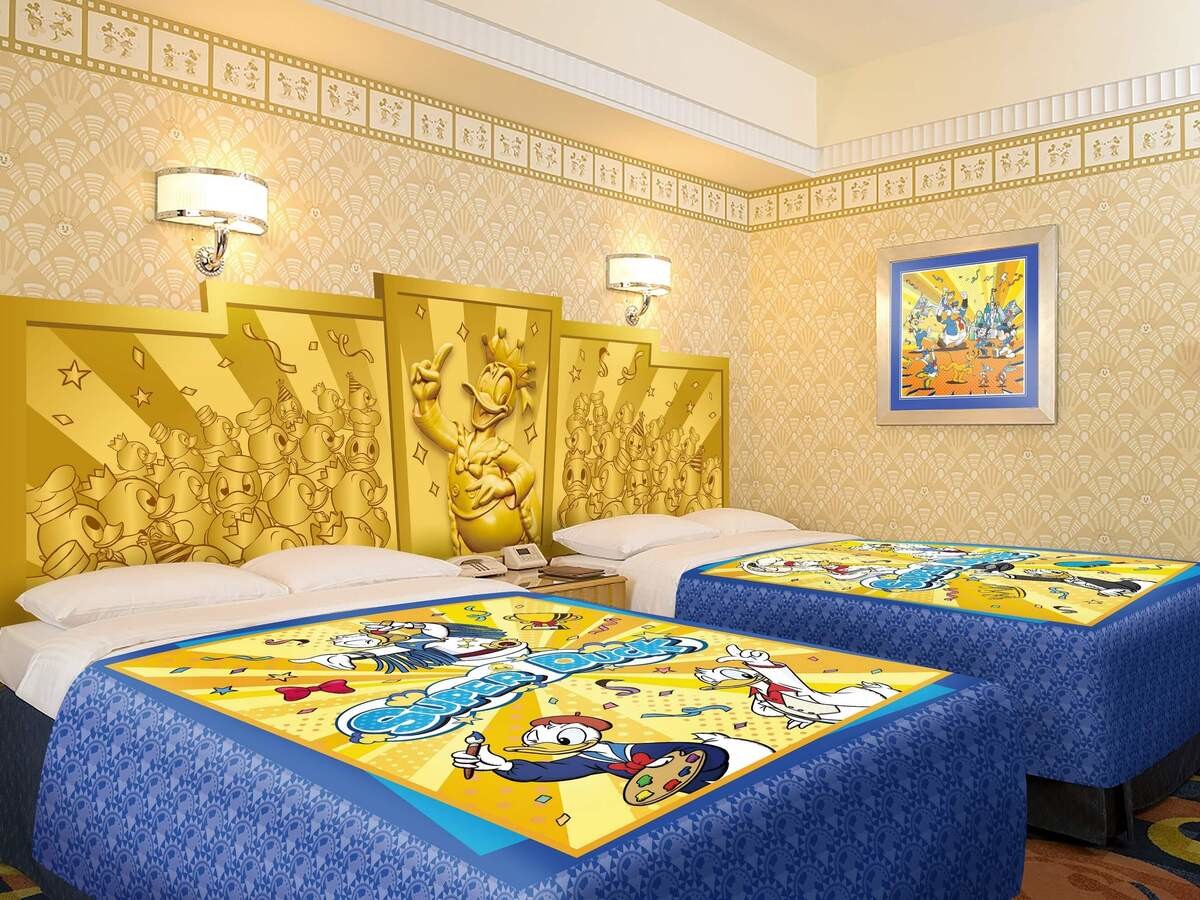 ドナルドがたくさんのクワッキーダックに囲まれているデザインのヘッドボードや、ミッキーマウスと仲間たちがドナルドを褒め称えている壁掛けアートが飾られ、ダックシティのにぎやかでユニークな世界が広がります。