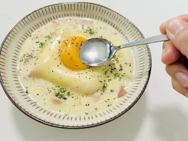 卵黄をのせる際にスプーンで押さえつけ、くぼみを作ることがポイントと紹介されていました。