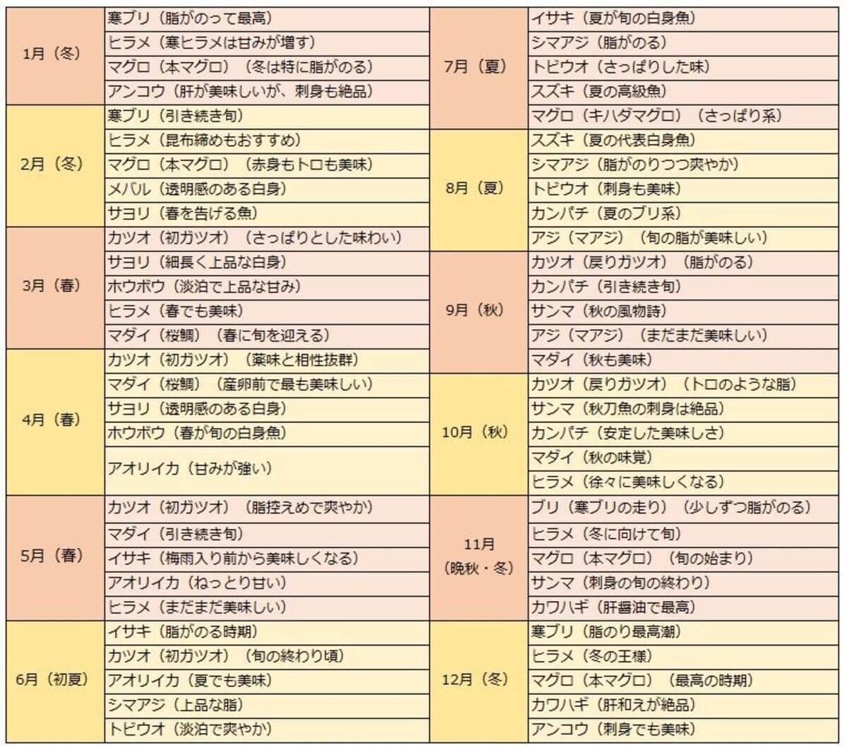 下記は、1月から12月までそれぞれ代表的な旬の魚です。ご参考にどうぞ。