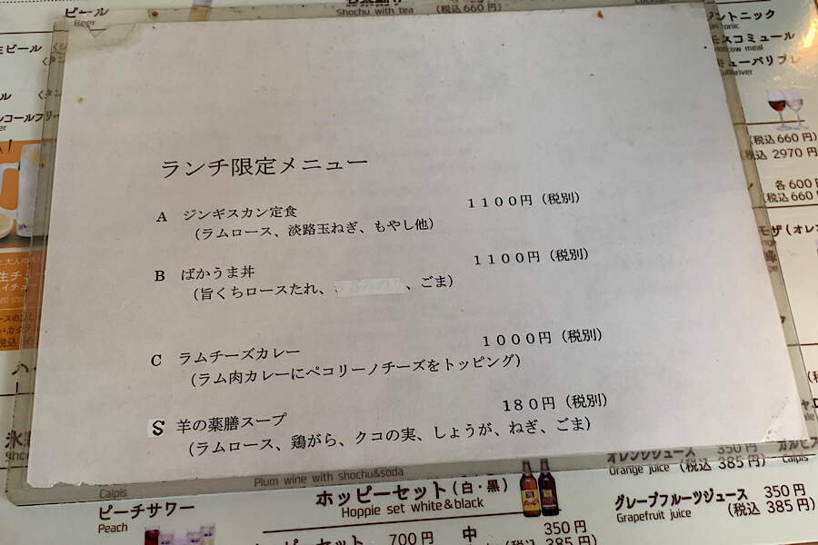 ランチメニューは3種類ありますが、ここはジンギスカン定食を選びます。