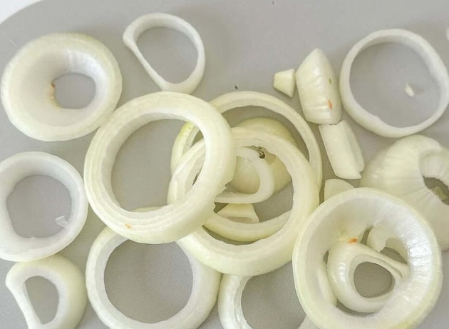 玉ねぎを1cm幅の輪切りにしたら、バラバラにほぐします。