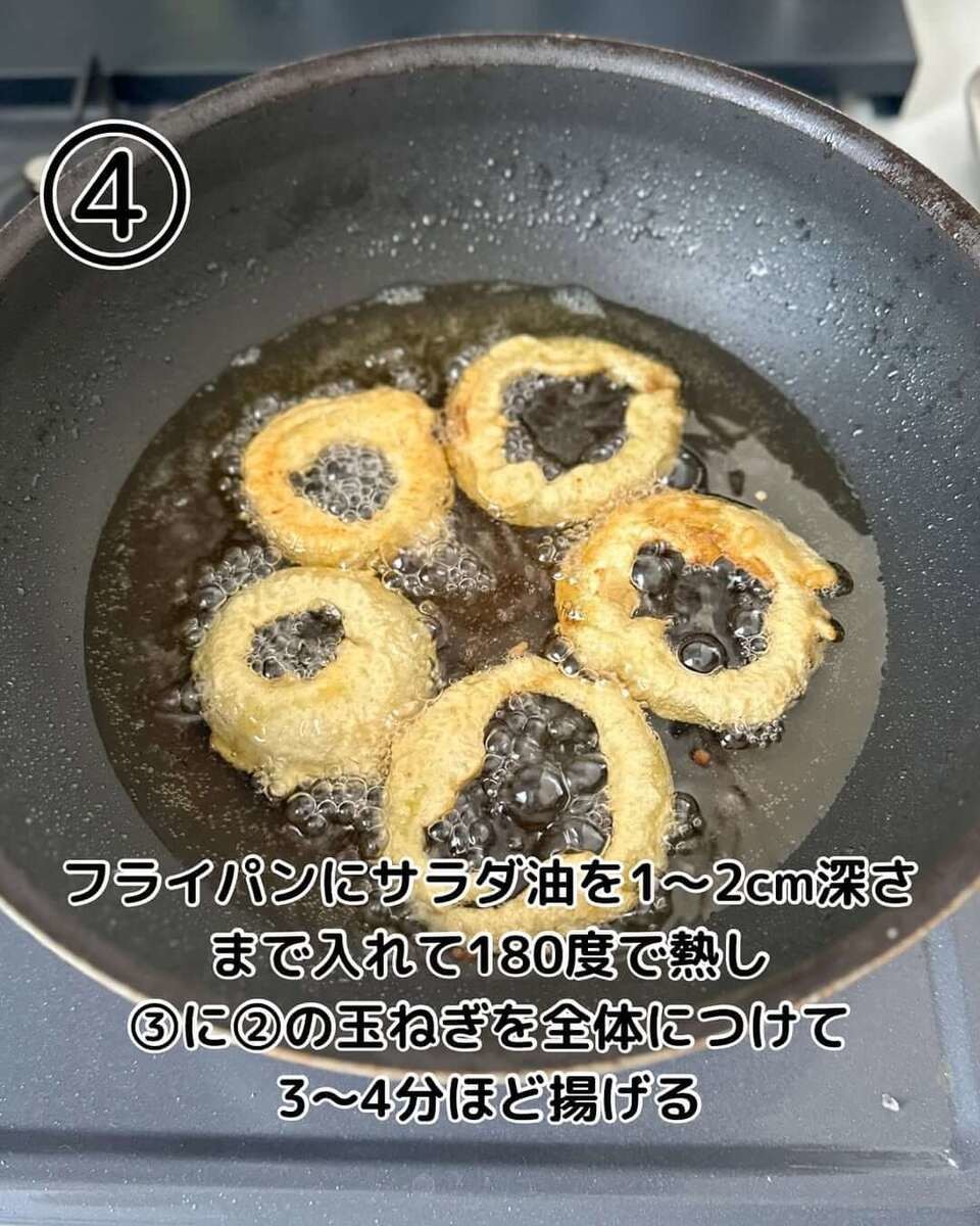 作り方③で混ぜ合わせた衣に、作り方②で用意した玉ねぎをくぐらせて3〜4分ほど揚げましょう。