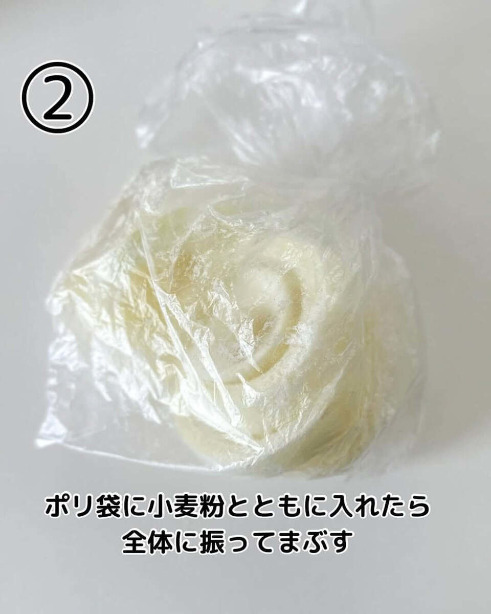 ポリ袋に小麦粉と玉ねぎを入れて、全体的にまぶしていきましょう。