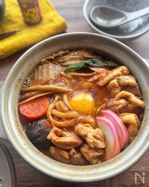味噌ベースのスープにキムチのコクがおいしいチゲ風煮込みうどん。半熟卵を絡めると、辛味がマイルドになって旨倍増!辛いものが苦手な方やお子様向けにはコチュジャンを調節してくださいね。