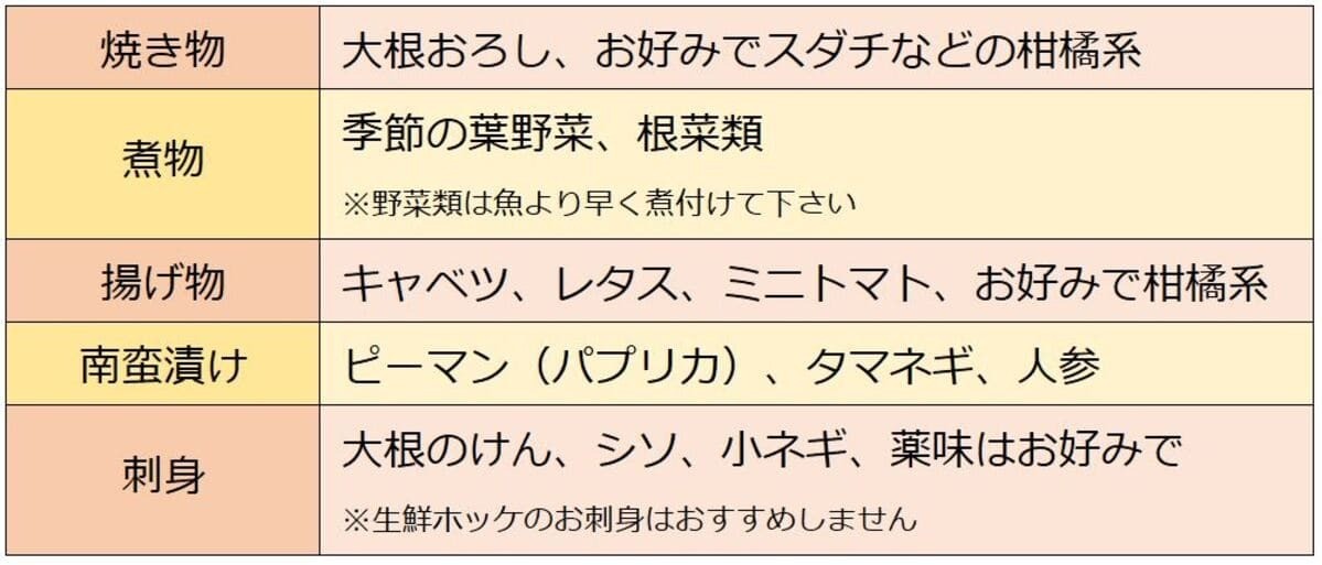 クラハシ担当者:その他では、調理方法によって下記の食材との相性もいいですよ。