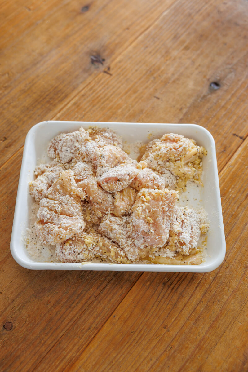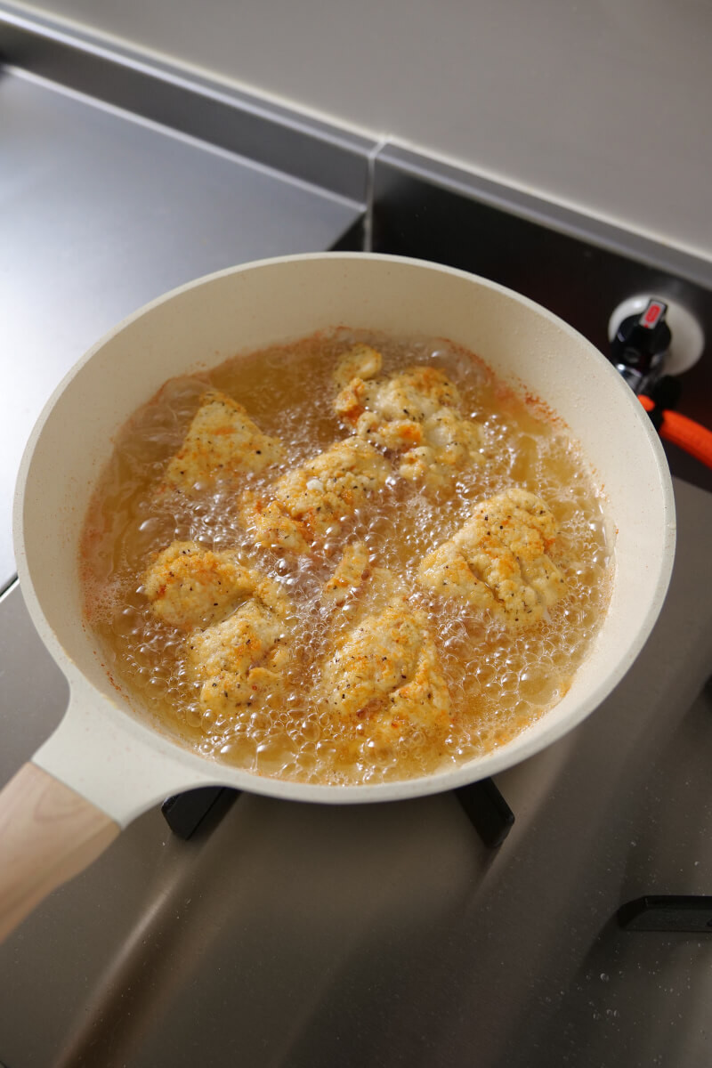 フライパンにサラダ油を深さ1.5cmまで入れて180℃に熱する。鶏肉半量の余分な粉をやさしく落とし、フライパンに並べ入れる。