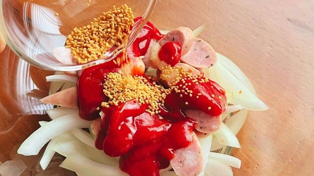 玉ねぎは薄切りにし、ウインナーは1cm幅の斜め切りにし、耐熱容器に移します。
