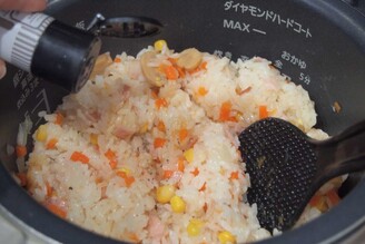 炊飯器に①の米を入れ、2合の目盛りまで水を注ぎます。そこに②のベーコン、玉ねぎ、にんじん、コーン、マッシュルームをバランスよくのせ、コンソメを加えて通常炊飯してください。