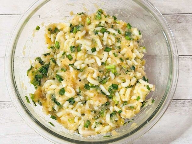 【1】の餡に細かくカットしたうどんを加えて混ぜ合わせます。