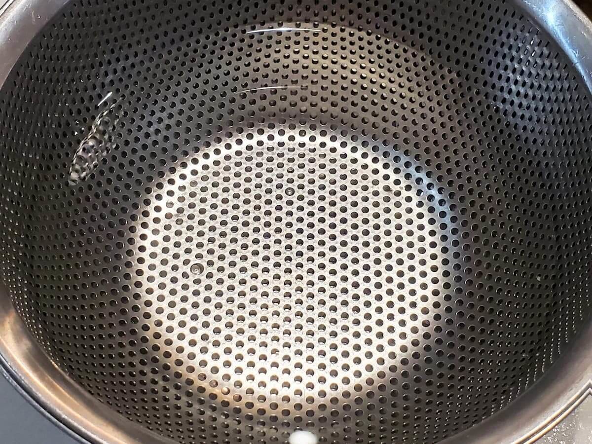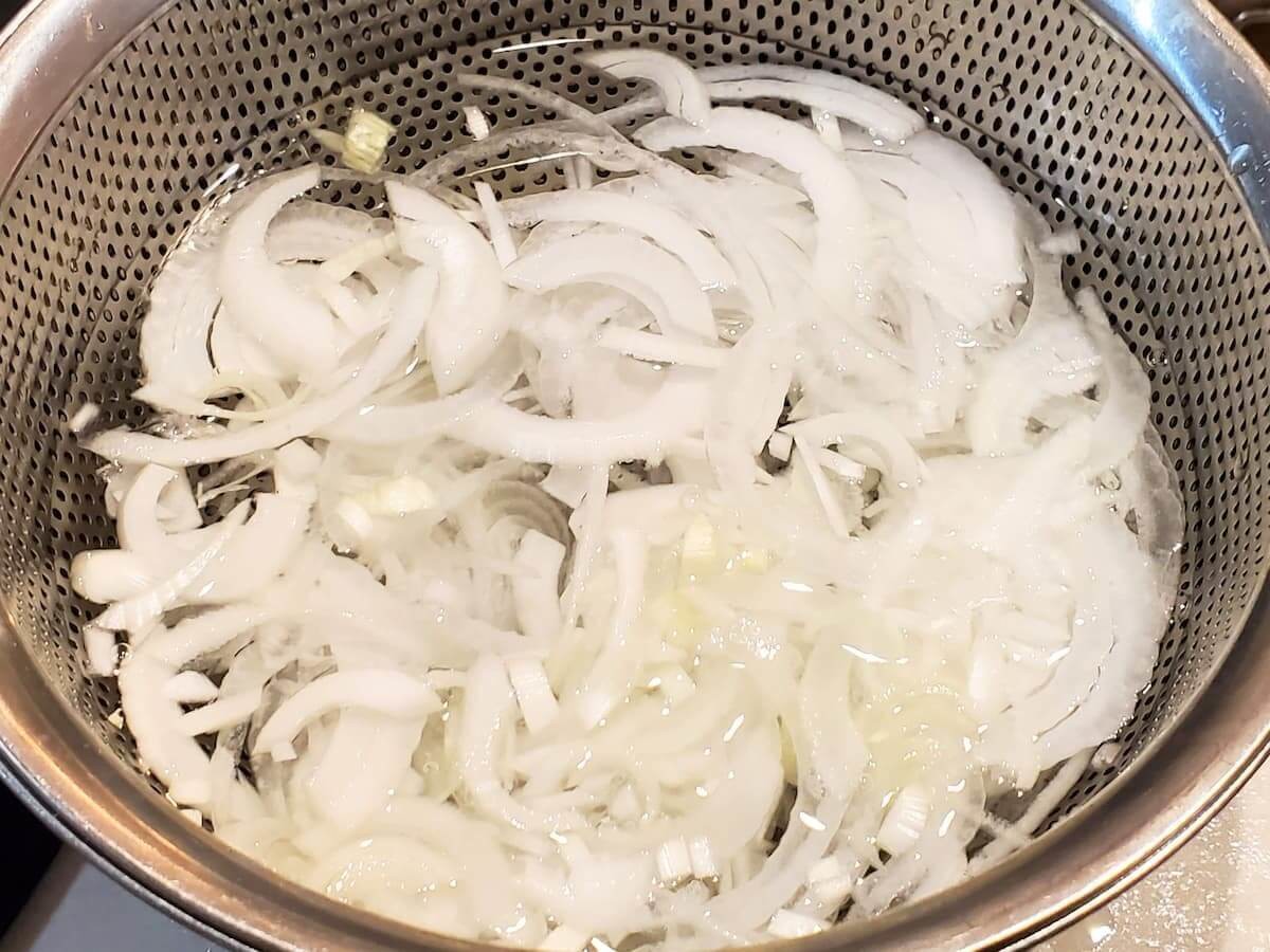 手順④ざるを持ち上げて、新玉ねぎの水気をしっかり切る