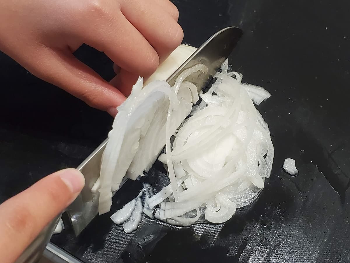 切った断面を空気に触れさせることによって、新玉ねぎの辛み成分である硫化アリルを気化させられるので、辛みを和らげることができるんです。