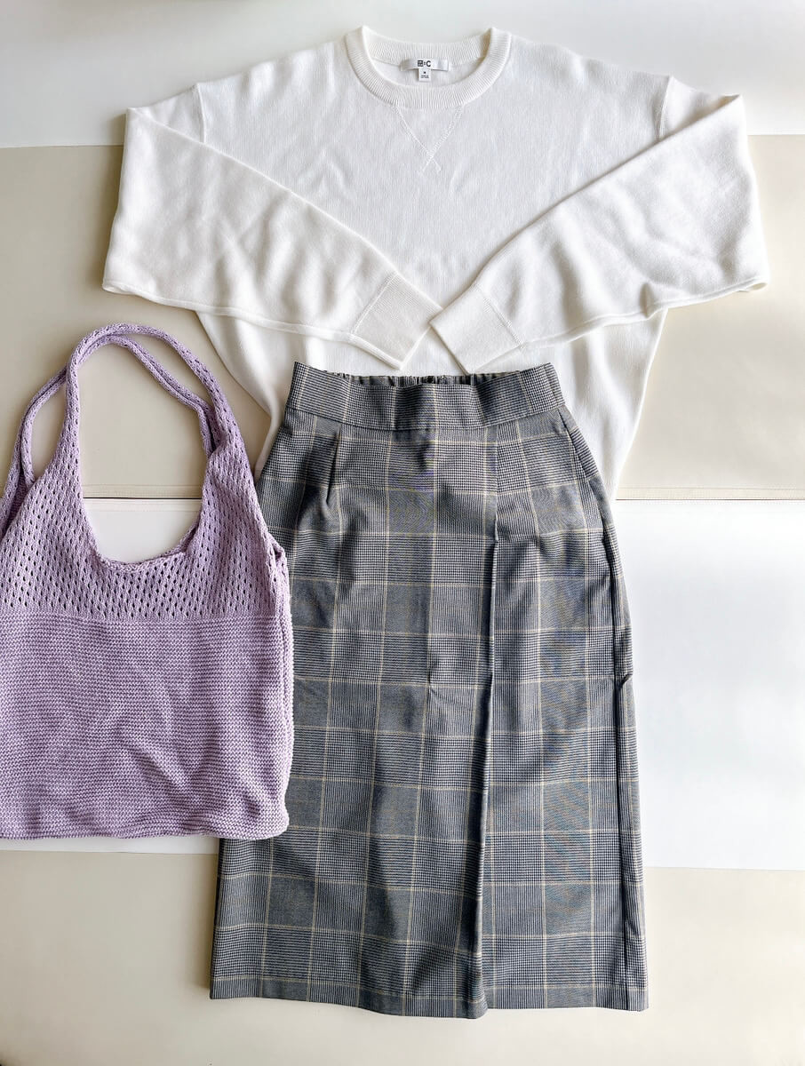 チェックのタイトスカートでカジュアルさと甘さを出したコーデに!タイトスカートなので、甘くなりすぎない点が◎。