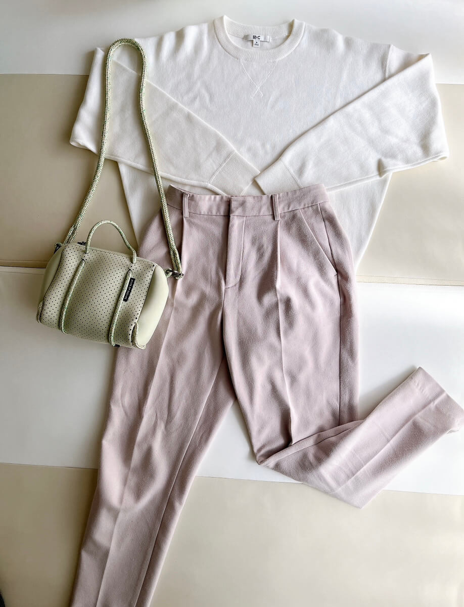 春先にもぴったりな、ピンクのパンツとの組み合わせはおすすめです。ゆったりとしたトップスフィットで、レジャーなどのおでかけに◎。やわらかい印象を演出してくれます。