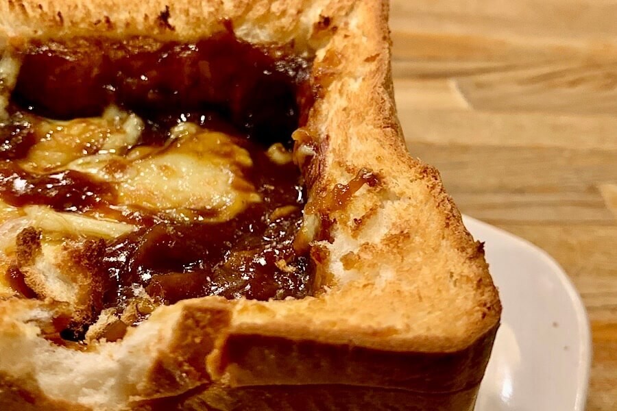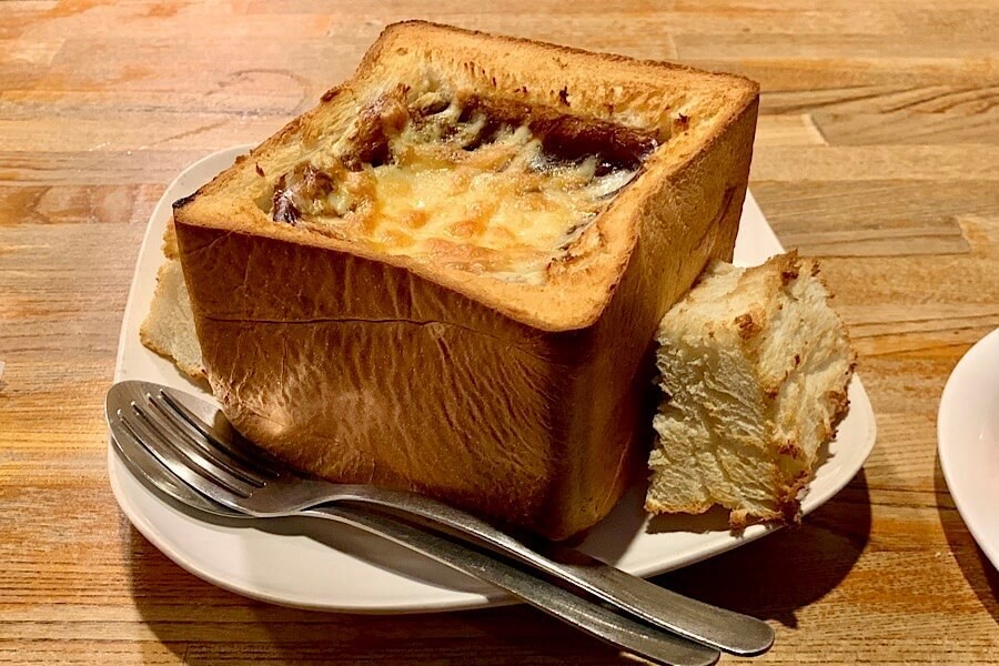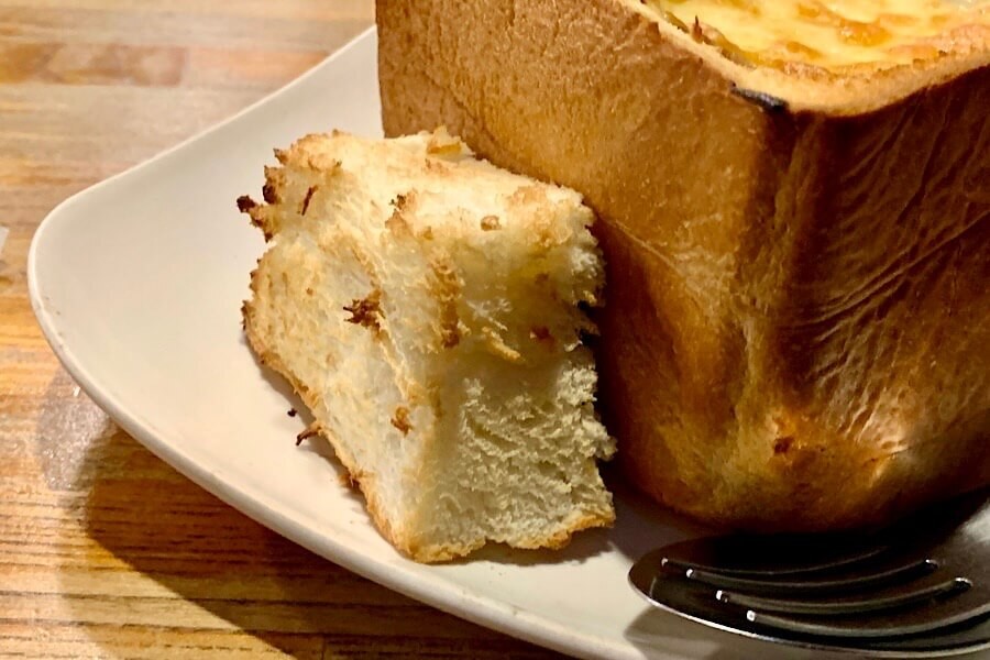 食パンの中をくり抜いてシチューを入れてあるので、くり抜いたパンもトーストして横に添えてあるのが微笑ましいです。