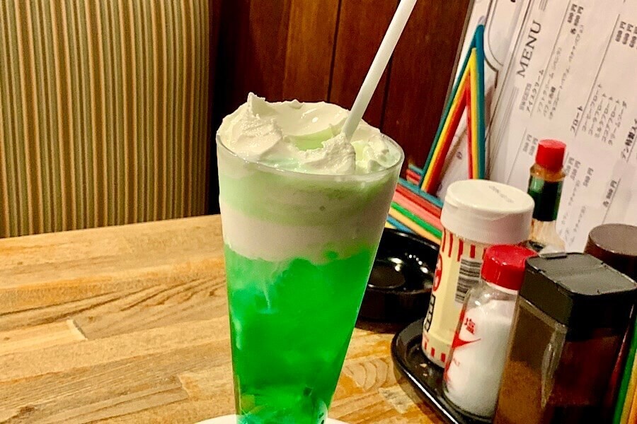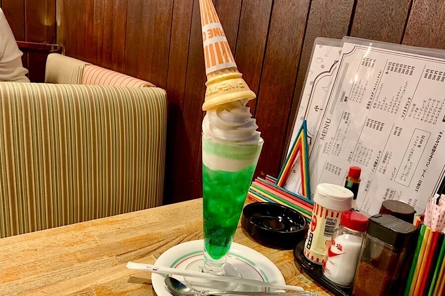 老舗喫茶店のクリームソーダにソフトクリーム