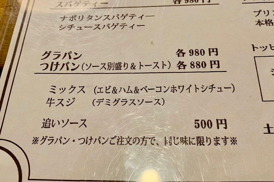 グラパンはミックスと牛スジの2種類から選べ、ミックスはホワイトシチュー、牛スジはデミグラスソースです。
