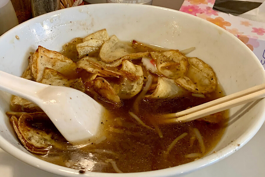 注文から30分くらい経ってようやくお目当てのラーメンが運ばれてきました。女将さんが「待たせちゃったのでポテトチップスを多めにしておいたわよ」と言ってました。