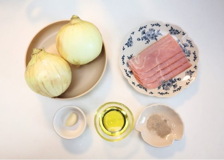 作り方⑤ベーコンとオリーブオイルに塩・胡椒で味付けし、新玉ねぎの上からにんにくと共に盛り付けたら出来上がり!