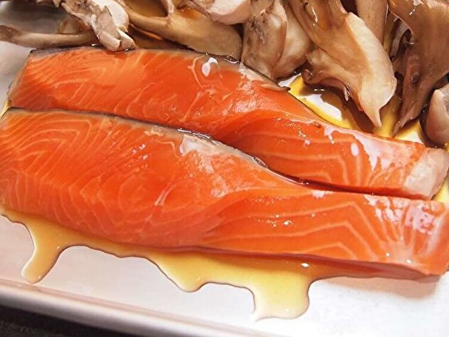 バットにさけと手で割いたまいたけを入れ、混ぜ合わせた【A】をかけます。