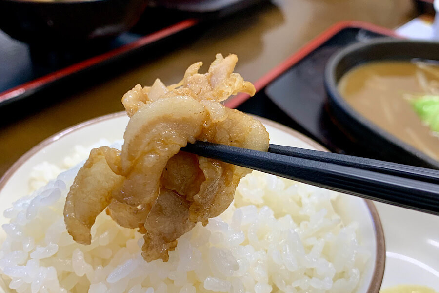 実際に食べてみると、豚肉が柔らかく、醤油とニンニクの味がたまりません!家庭でできそうで、できない味。