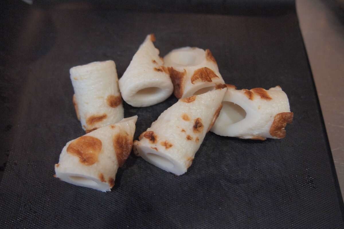 ちくわは食べやすいように5~6等分にカットします。 今回は栗原さんの真似をして、斜めに切ってみました。