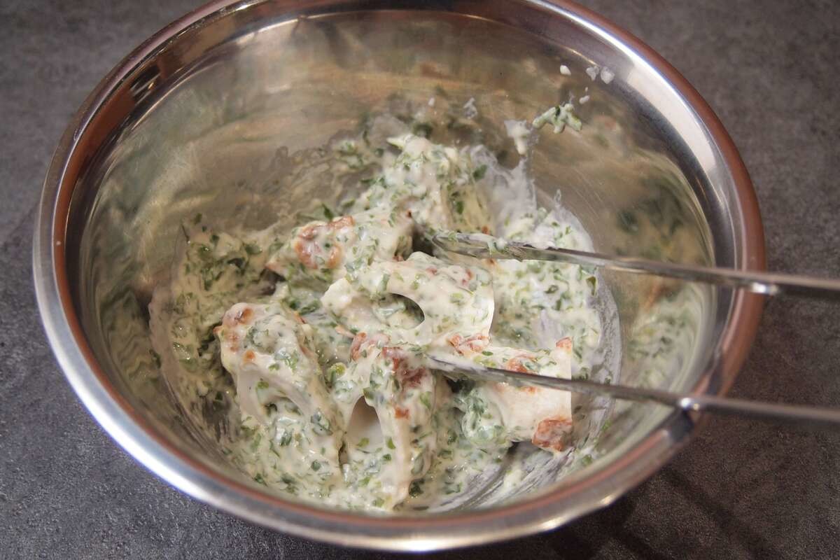 冷水を使い、混ぜすぎないことで、グルテンの形成をおさえられ、パリッとした衣に仕上がりますよ。