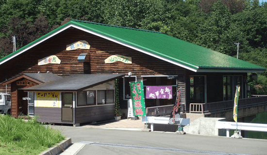 おみやげコーナーでは「魚沼産コシヒカリ」や「手焼せんべい」、山菜加工品、地域の方の手作りの手工芸品などを取り揃えております。湖上レストラン「鏡ヶ池」(冬季休業)では地元の食材を活かした山菜料理や手打ちそば、コシヒカリのおにぎりが好評です。