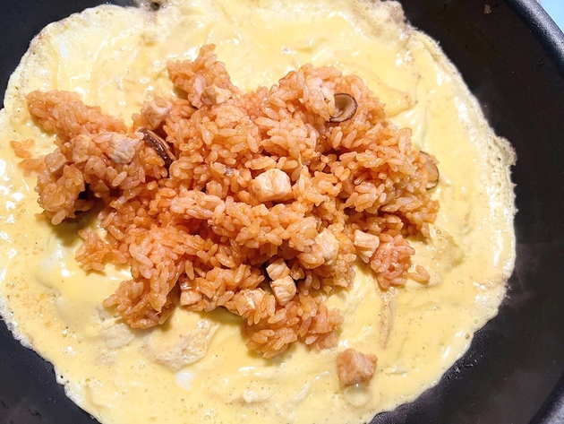 卵の中央にチキンライスの1/4量を細長くのせ、卵の周囲にぐるりとヘラを入れてはがします。