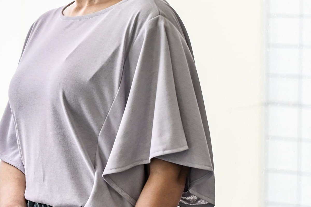 「二の腕も隠れるので細見えします。また、グレーはなじみやすい色なので大人も使いやすいカラー。白だとアクティブすぎる印象になることもありますが、グレーならフェミニンにまとめてくれます」(大石さん)