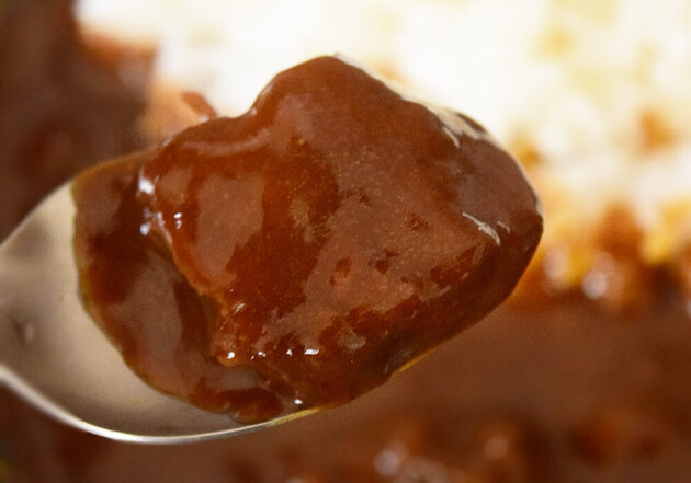 牛肉のサイズは大小さまざまで、8個くらい入っています。ハウス食品のレトルトカレーとしては「最大の肉量」なのかもしれませんね。