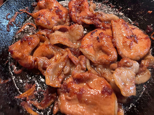 ほんのり焦げ目がついた豚肉の、やわらかそうな質感。期待通りの照りと匂いに思わず写真を撮るのを忘れて食べるところでした。危ない危ない。