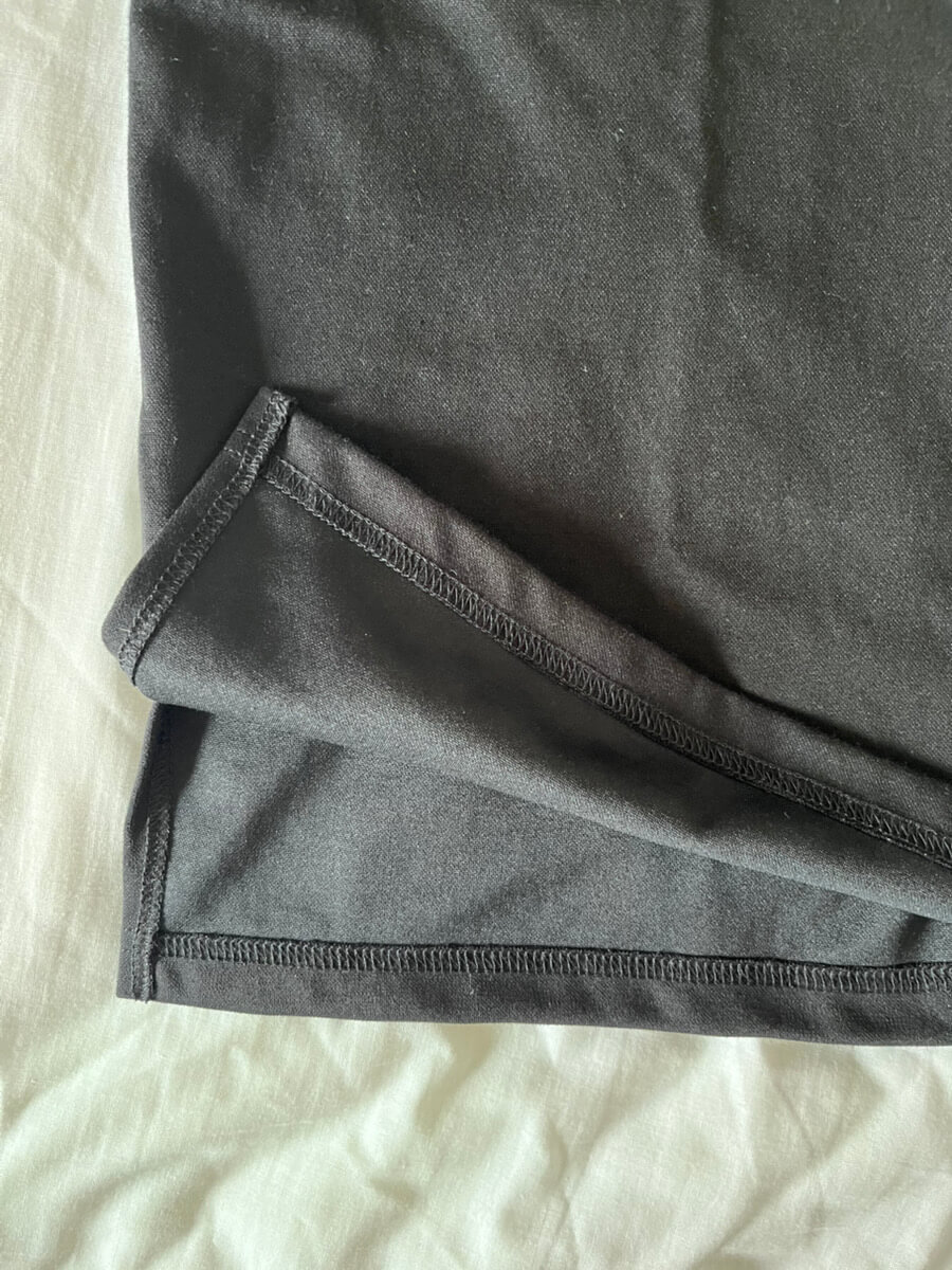 筆者は細見えの印象を重視し、ブラックを購入!触り心地がとにかくサラっとしています。裏面は特殊な形状の糸が使用されたポンチ素材で、なめらかな肌触りが特徴です。