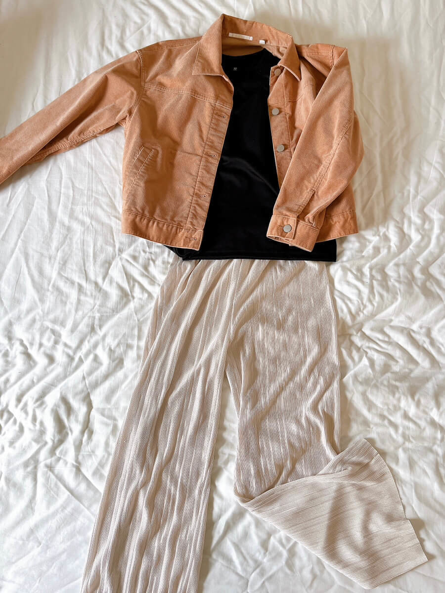 肌寒い季節は、ジャケットを羽織って甘辛コーデに仕上げるのがおすすめです。