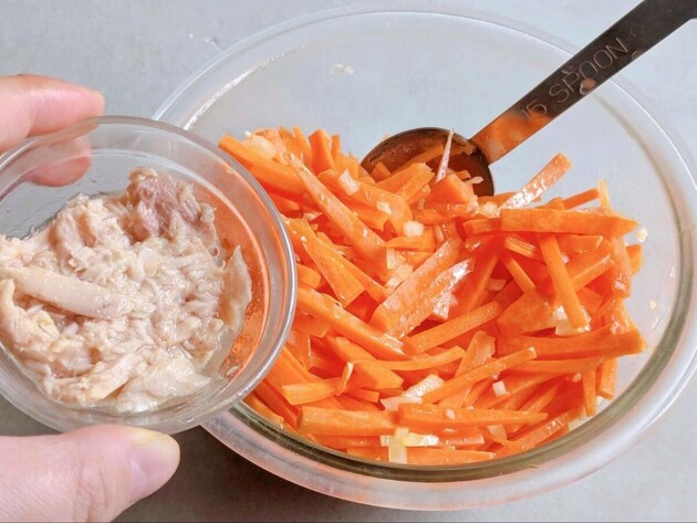 皮をむいたにんじんを5〜6cm長さの細切りにし、耐熱ボウルに入れます。ツナは汁けをきっておきましょう。
