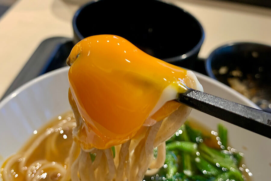 朝そばは、きつねorたぬき、そばorうどん、温or冷を自分の好きな組み合わせで注文することができます。そのすべてに温泉玉子が付いてきます。