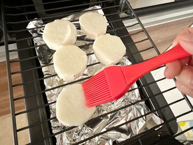 作り方②グリルに長芋を並べて表面にごま油をぬり、中火で3~4分焼く