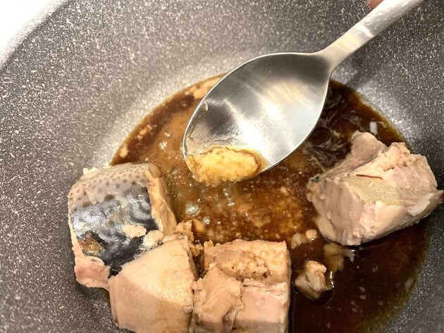 男子ごはん×サバ缶②おろししょうがを加えて煮る