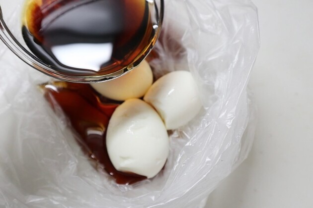 まずは、めんつゆにオイスターソースを入れて作る、コク深い味玉を紹介します。