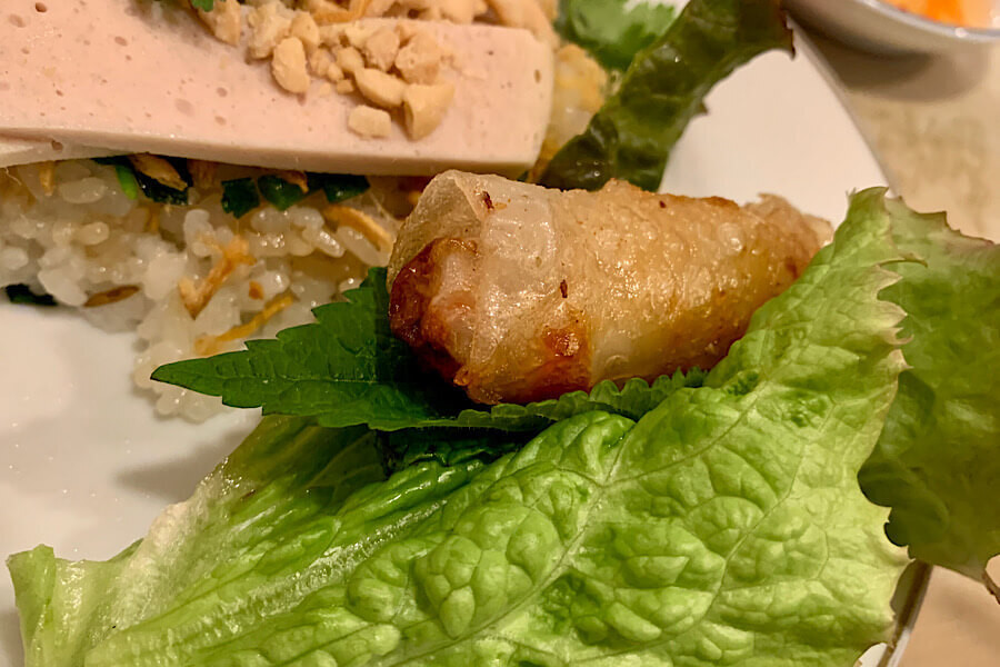 この店では、野菜と生のハーブが付いてくるので、揚げ春巻きを巻いてたべるとさっぱり食べられます。ハーブの爽やかなかおりと油のコクと海老の香りが一体化します。