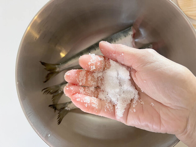 下処理したイワシをボウルに入れ、ひとつかみの塩をまぶし、30分ほど置いておきます。
