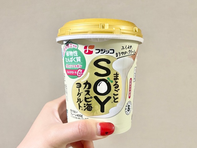 今回使用するのは通常のヨーグルトではなく、大豆をまるごと使った「まるごとSOYカスピ海ヨーグルト」。乳・豆乳不使用で、自然な大豆風味が楽しめます。