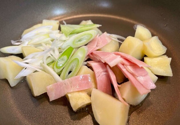 フライパンに油をひいて中火くらいで熱したら、じゃがいもとねぎ、ベーコンを入れて炒めます。