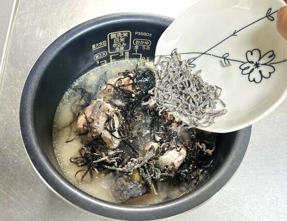 さらに、今回のメインである塩こんぶとさば缶の身を炊飯器の中へ。ここまでほんの3分くらいでできました!